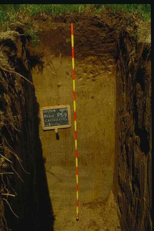 Bw | 30 - 70 cm; poco umido; colore matrice umido giallo oliva (2,5Y6/6); sabbioso; struttura poliedrica subangolare grande con aggregazioni moderatamente sviluppate; non calcareo; pori pochi, fini; poche radici molto fini; limite inferiore chiaro, ondulato. |